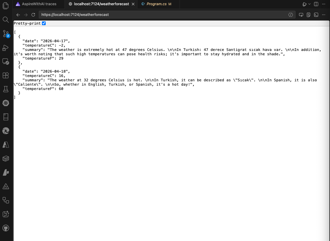 After running the application with aspire run, click to the url for api project and append it with /weatherforecast to see the agent in action as shown below. You should see the weather description for given degree in celcius in different languages including English and Turkish as shown below: