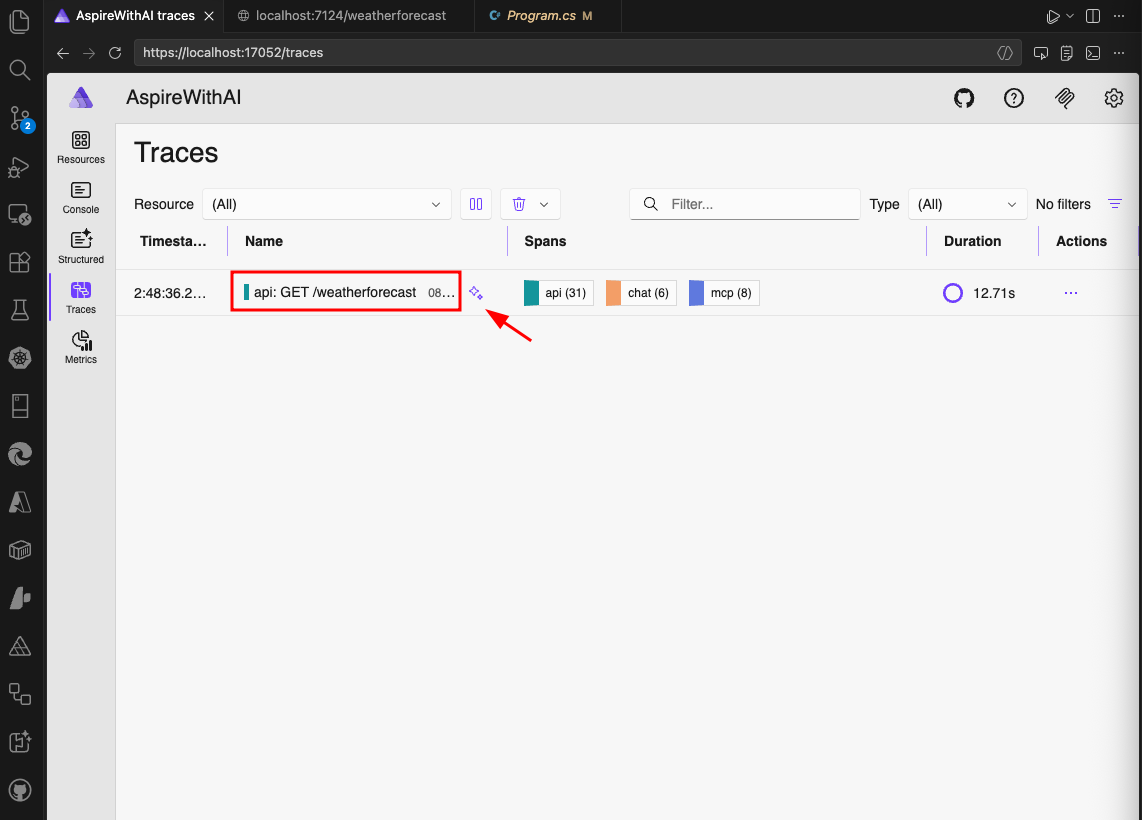 If you navigate to Traces on dashboard, you should see the trace for the request you just made and if you click to the trace, you should be able to see the details of the trace including the calls made to mcp server as shown below, this icon indicates GenAI: