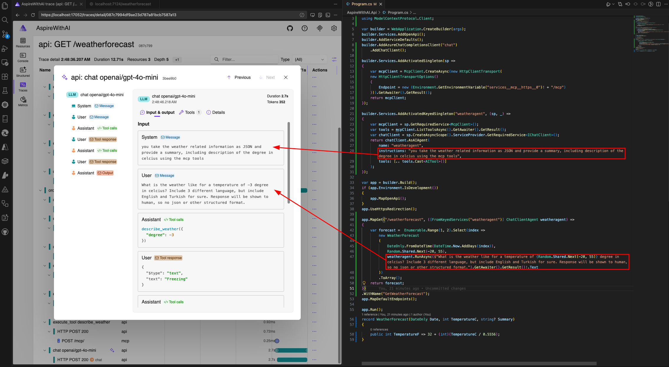 In this blog post, we will create an API project with dotnet to consume github models to create agent. This agent will use MCP toolkit we will be creating as part of the workflow. We will use Aspire to orchestrate the solution and use dashboard to monitor GenAI logs. Final code can be found in here